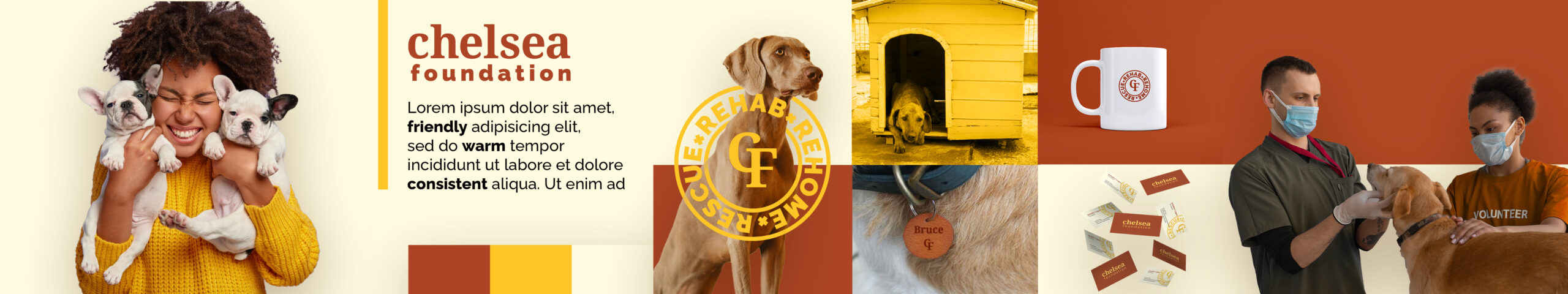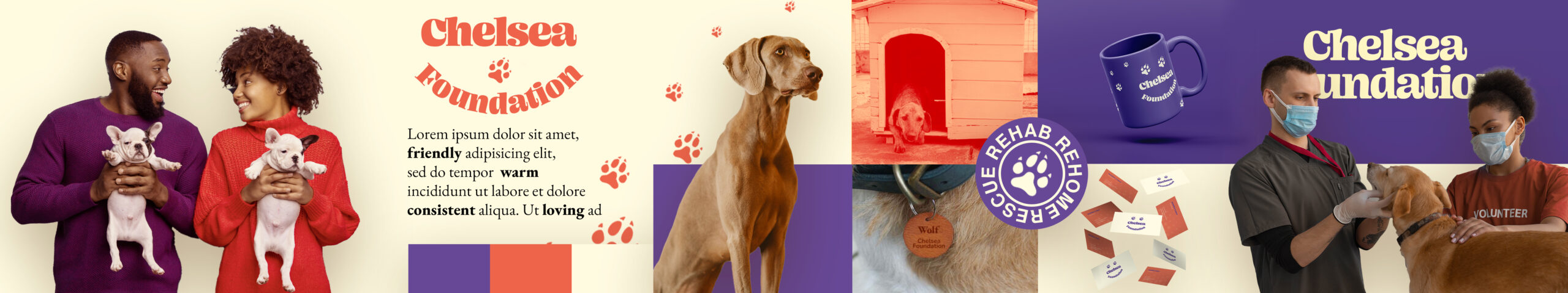 The Chelsea Foundation is dedicated to rescuing, rehabilitating, and rehoming derelict dogs, driven by a mission to provide compassionate care for animals in need. Their brand reflects core values of empathy, kindness, and commitment to animal welfare. With a focus on creating a welcoming and trustworthy image, the foundation aims to engage a community of animal lovers and supporters who share their passion for giving every dog a chance at a better life